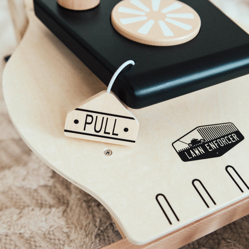 Your little landscaper will love our Lawn Enforcer!  They can release the gas cap and fill with pretend gas, then pull the ripcord to start the pretend engine.  Turning knobs and chunky wheels add to the charm of this fun mower.  The front wheel clackers make sounds when pushed while mowing the carpet in the playroom, or the floor in the kitchen!