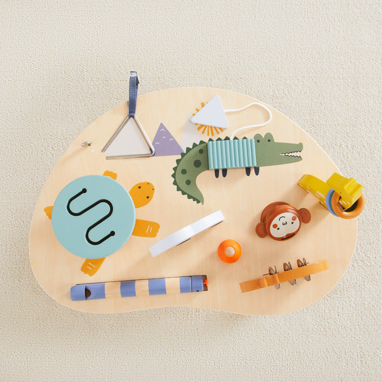 Get your little musician composing early with our Mini Music Maker. Our pint sized orchestra can be played on the floor or at the table, and includes giraffe rattle, hippo tambourine, snake whistle, elephant bead shaker, alligator ribbed xylophone, turtle drum, monkey castanet, and mountain triangle. Let's make some music!